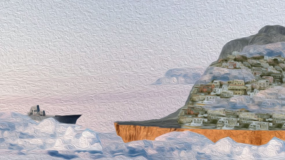 Captain Varda stepped into the sun. The bright light shone brightly against the grey metal of their vessel. Captain Varda looked to the skies below, and to the island beyond. The island hung in the sky. Crawling upon it, like ants on a lump of sugar, were the hustling, bustling citizens of this port town. You could see them swarming at the docks, awaiting the arrival of the ships. Further along, only the faint trace of action was perceivable through the cracks of the tightly-huddled houses. The browns, reds, blues, and blacks coalesced into a canvas of the small port town, rather than standing as distinct elements.